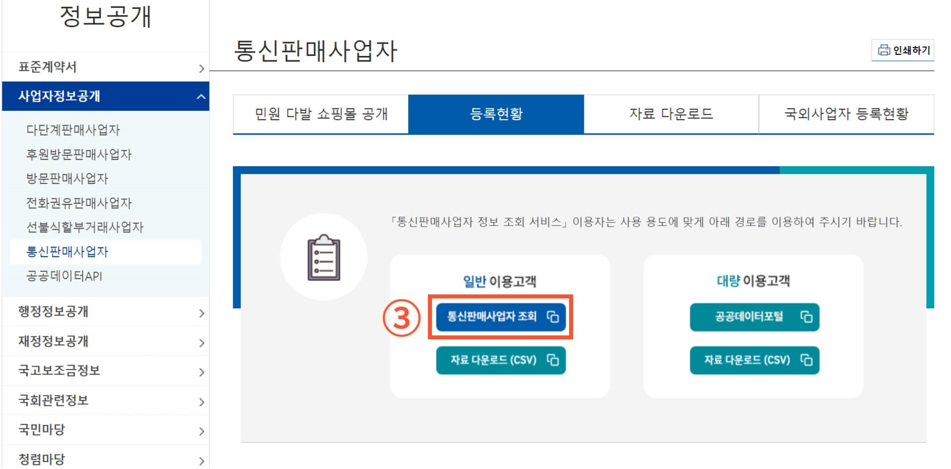 1. 공정거래위원회 홈페이지 접속 → 정보공개 → 통신판매사업자